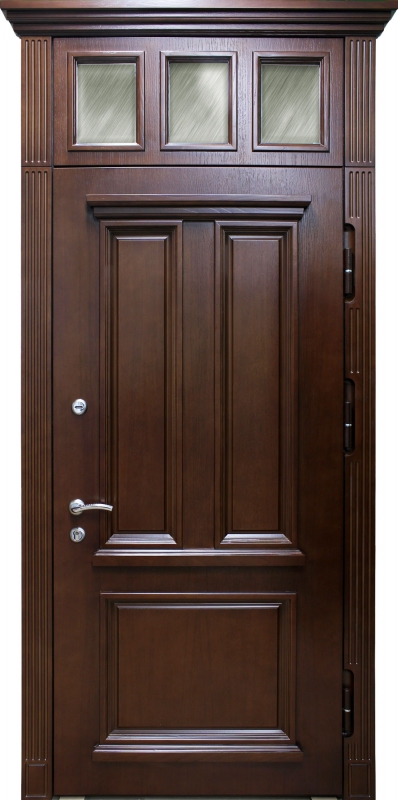 Дверь с сувальдным замком и фрамугой №34 идеально сочетает в себе стиль и надежность. Панель из натурального дерева, использованная как для внешней, так и для внутренней отделки, придает двери благородный и элегантный вид, делая её отличным выбором для помещений с классическим или современным интерьером. Каркас двери выполнен из профильной трубы 50х25 мм и усилен ребрами жесткости, что гарантирует прочность конструкции. Замки от производителей "Просам" и "Мосрентген" с тремя ригелями обеспечивают высокий уровень безопасности. Дверь оснащена уплотнителями с двумя контурами, что гарантирует отличную герметичность, а возможность замены замков и добавления кованых элементов делает её адаптируемой под любые требования. Кроме того, дверь можно дополнить зеркалом, стеклопакетом или видеодомофоном для еще большего комфорта. Входная дверь с сувальдным замком и фрамугой №34 от производителя: быстрое изготовление и монтаж в Боровске, индивидуальные размеры, широкий выбор материалов и фурнитуры, официальная гарантия до 10 лет.